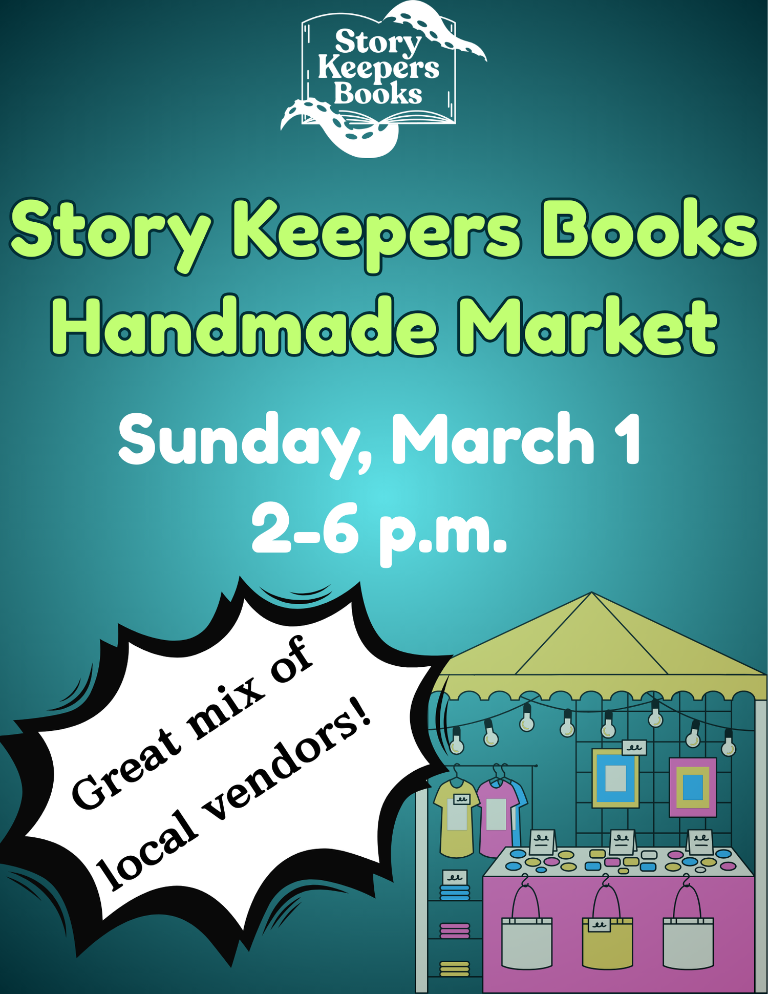 On Sunday, March 1 from 2–6 PM, Story Keepers Books transforms into a Handmade Market filled with one-of-a-kind, artisan-crafted goods. We’re clearing the shelves and handing the spotlight to talented local makers — from art and décor to gifts you won’t find anywhere else.
